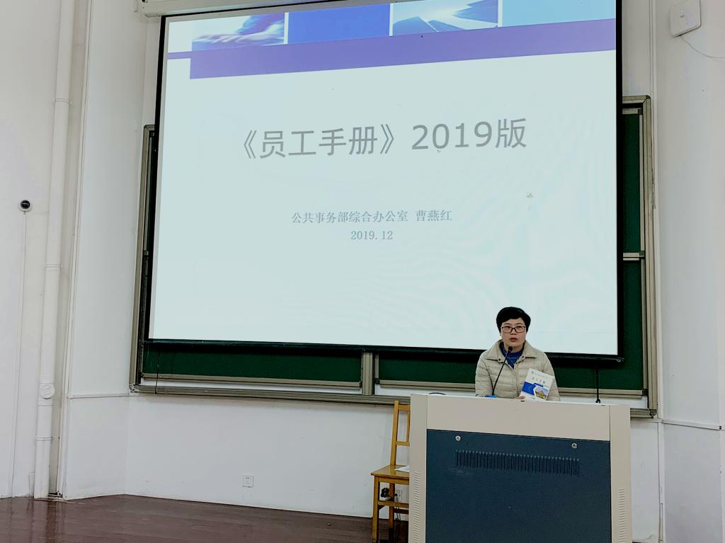 2019年12月20日下午13:15,公共事务部在4教101组织后勤员工学习2019版《员工手册》。公共事务部人事主管曹燕红出席了本次学习会,全体后勤员工参加。