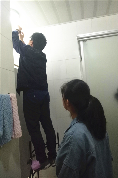 在学生跟着维修师傅一起工作的过程中,维修工作人员还不时告诉学生一些小技巧、小常识。如遇到维修洗手盆漏水的,他就指着水管告诉学生,哪个是热水管哪个是冷水管,并指着总阀门提醒学生当寝室洗手盆出现漏水的情况,一时之间难以修复的时候,可以把阀门关掉,这样就不会漏水了。整个活动过程中,同学们看到了洗手盆漏水时维修人员蹲地、矮着身子更换三角阀的模样;看到了厕所门无法打开时他拿着一字螺丝刀开锁的神情;看到了他更换灯泡灯管仰头专注工作的背影;也看到了他疏通下水道的场景。参加本次活动的学生童子奇说:“如果不是参加了这次活动,我永远不会知道维修师傅们那么辛苦,平时我们仰头一会儿就觉得很难受,而维修师傅要仰头那么久,真的特别辛苦,也特别佩服他们。”而王莎同学还向工作人员建议到:“如果下次再组织这样的活动,应该多让男生参加,增加一些生活经验。”