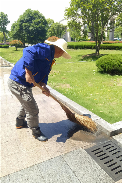 站在学术楼东南角、亦或是从学院东大门往西南望,就能看到三名物业人顶着烈日清洗着马路。只见他们三人一人拿着水枪,一人拖曳水管还有一人清扫着马路上的积水,分工明确,配合默契。水枪中喷出的水柱将地面、窗户、雨篷上的污垢冲刷干净,保洁员用扫帚将地面刷扫一遍的同时,亦将残留的积水清理到下水道中。在水枪的冲刷和保洁员的清扫双重作用下,地面、窗户、雨篷变得更加干净整洁。