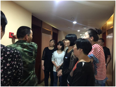 讲座结束后,毛队长作为监督指导人员在学术中心进行了消防演习,本次演习以学术中心客房508房间为火灾发生地点。演习开始,客房部的阿姨作为楼层负责人在第一时间发现火灾并大声叫喊引起上下楼层负责人的注意,然后迅速按下附近的消防警报按钮并且马上拨打校园110通知学校保卫人员进行救援工作,拨打前台电话通知其发生火灾以便迅速组织客人疏散。当火灾第一发现人正在做这些工作时,其余人员听到阿姨的叫喊和警报,到达了火灾现场分工合作。一部分工作人员马上对同层其余客房一一敲门通知客人并引导客人到安全通道逃生,另一部分工作人员打开消防栓用灭火器和水枪扑灭火源,保卫人员到达后由保卫人员接手灭火工作,其余工作人员马上从安全通道逃生,保卫人员灭火搜救工作完成,演习结束。
