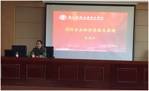 公共事务部全体员工的安全意识,熟练掌握消防火灾的应急处理程序,熟练使用消防器材扑救初起火灾,学会引导疏散客人及贵重物品,2017年5月9日下午在学术中心报告厅1展开了消防安全知识讲座和消防演习,并对消防器材的使用进行了简单的训练。本次讲座由长安镇消防大队队长毛生江主持。