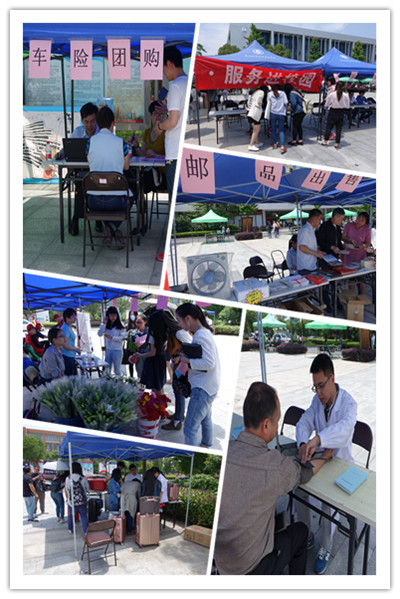 活动伊始就吸引了大批师生前来参与。他们分别就自己关心的问题与服务人员进行了沟通。如医疗义诊摊位,医务室的医生们把专业医疗器具带到了活动现场,不少师生前来测量血压和咨询健康问题;人保财险摊位,一直陆续有老师咨询和办理车辆保险业务;邮品出售摊位,展示的邮册吸引了不少集邮爱好者;电脑维修摊位,不少学生拿着笔记本前来维修;花卉展销摊位,一束束含苞欲放的百合、扶桑香气扑鼻……