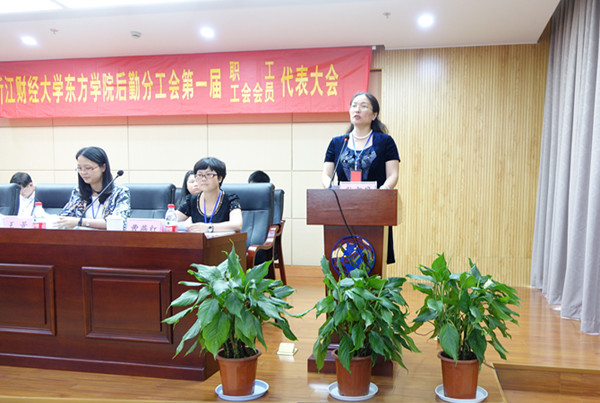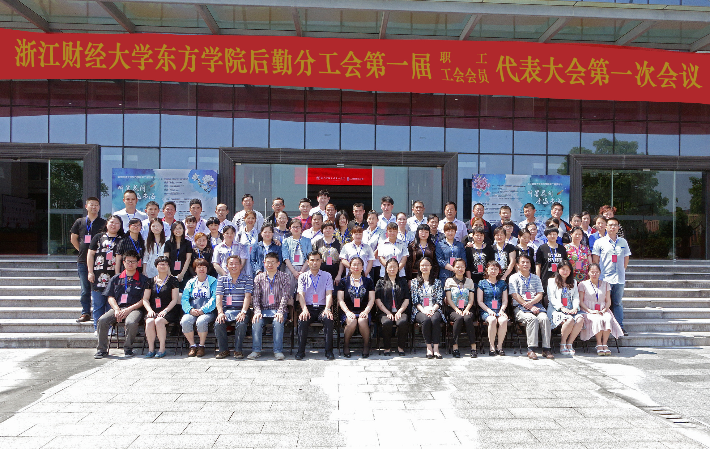 2015年5月22日,浙江财经大学东方学院后勤分工会第一届职工代表大会暨工会会员代表大会第一次会议在学术中心一号报告厅隆重召开。东方学院副院长、工会主席何淑贞,浙江财经大学后勤服务中心党总支书记、后勤分工会主席蔡飞龙,东方学院党院办主任、工会副主席王影,东方学院工会专职干事戴钰慧应邀出席,东方学院学生工作部部长王景、公共事务部部长余健、副部长金佩霞,以及后勤分工会所属行政部门中心负责人作为特邀代表也参加了大会。大会由后勤分工会委员沈奇主持。