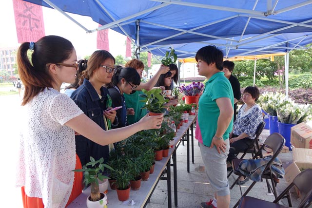 绿色植物展销摊位芳香扑鼻、争奇斗艳,吸引了爱花的师生们。百合、玫瑰,还有很多说不上名的小盆栽,纷纷被喜爱自己的“主人”领回了家。11:30—12:00,主办方推出限时秒杀,价格低得惊人,瞬时吸引了众多师生,现场气氛十分热烈,准备好的绿植很快就被秒杀一空。