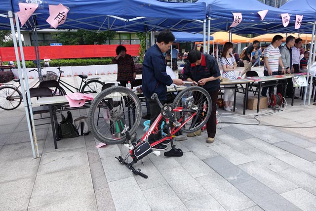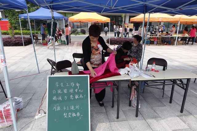 活动伊始就吸引了大批师生前来参与。他们分别就自己关心的问题与服务人员进行了沟通。如自行车修补摊位,师傅们正在为师生们的自行车打气、换胎、上润滑油、更换零件,手被油污染黑了,也视而不见,依然忙个不停。衣物缝补摊位,宿舍阿姨们正在为学生缝补衣服,让学生感受到妈妈的温暖。收发服务摊上,出示的邮票展吸引了不少集邮爱好者,同时,物业服务中心收发工作人员还义务为学生收发邮件答疑解问,让师生们认领长时间未领取的“疑难杂件”。
