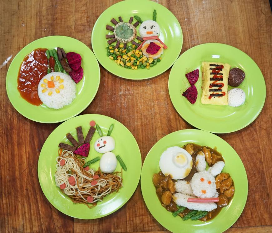 所谓“童趣套餐”,自然要有可爱的造型,来激发大家的童心。如用米饭做成小兔子的形状,把面条铺成草原,将蛋包饭做成小汽车的造型。而光有可爱的造型还不够,味道和营养的组配也是我们所注重的,用鸡蛋做成太阳,用火龙果做成耳朵,用牛肉做成岩石,让大家在品尝套餐是也兼顾到了营养的均衡。