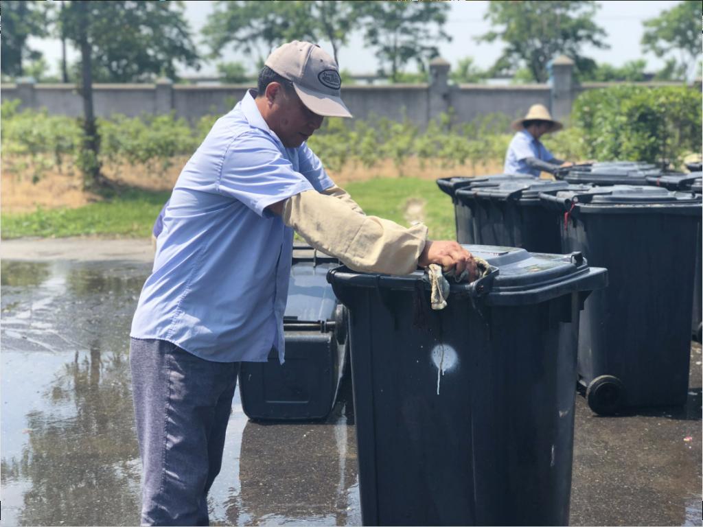 6月,天气越来越热,瓜果、甜品等越发受学生喜爱,垃圾箱内垃圾量剧增,且更容易腐败变质、孳生蚊蝇;为此,物业中心在做好日常清扫垃圾桶工作的基础上,开展生活区垃圾桶集中清洗活动。活动中,保洁员用高压水枪对垃圾桶内外进行冲洗,用铁丝球蘸上洗衣粉对顽固的污渍进行擦拭,最后用干净的抹布将垃圾桶擦干、晾干,保障垃圾桶清洗干净,不散发异味,不招惹蚊虫。