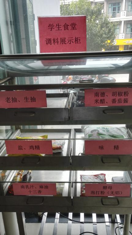 为了让食品安全更透明,让师生吃的更放心,饮服中心在一食堂一楼大厅设立了调料展示柜,让大家直观的看到每天吃的菜肴都使用了哪些调味品。