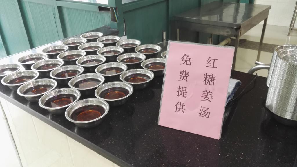 当军训学员来到食堂就餐,喝上一碗暖暖的红糖姜茶,所有的寒气都被一扫而光。