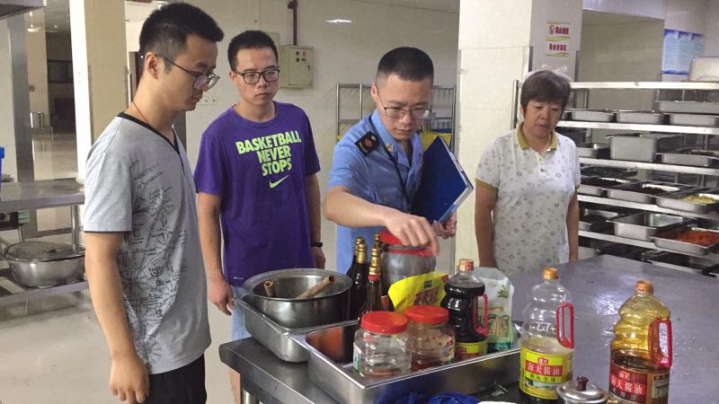 暑假期间饮服中心完成了一食堂二楼的就餐大升级改造以及二食堂美食城的引进,就餐模式得要很大的提升和丰富。这些都是从就餐环境上的提升,而抓好食品安全工作才能让师生们在优雅、舒适的环境下安心就餐,真正做到餐饮品质的“表里如一”。9月15日饮服中心协同食药监部门对各餐厅以及美食城各档口进行食品安全专项检查。