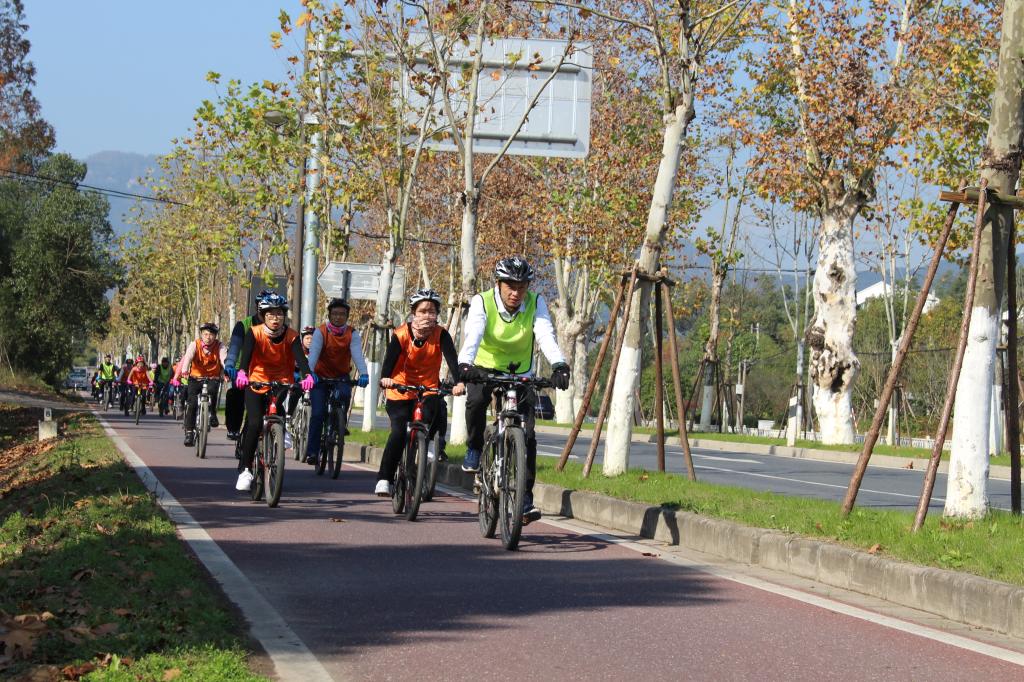 培训伊始,教练指导大家进行趣味热身活动,并把参训人员分为两个团队,队员们分别为自己的团队取了队名,制定了口号并绘制了队旗,进行了团队展示:“雪峰队”精诚合作,登封造极;“路路通队”一路向前,畅通无阻!随后教练向大家讲解了骑行的注意事项及越野自行车具体的操作方法。在教练的指导下,各队队员出发骑行。骑行中,队员们个个热情高涨,全力投入。