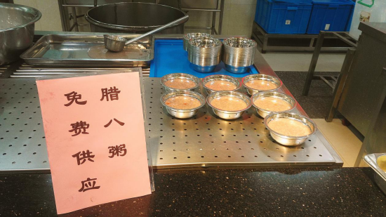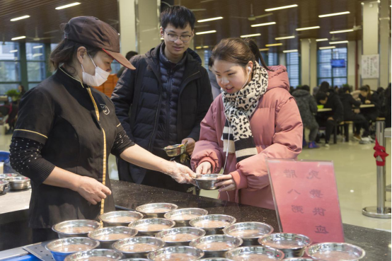 1月11日一早,来到一食堂吃早餐的师生们都能免费领取一碗热腾腾的腊八粥,这是饮服中心为大家准备的一份节日礼物。莲子、桂圆、红枣、银耳、芸豆、葡萄干、枸杞、糯米,熬煮一个多小时,软糯香甜,每一口都像是在温暖被窝里香甜的梦。在这阴雨湿冷的日子里,喝上一碗暖暖的腊八粥,不仅为考生们这两天的考试征程注满能量,同时也告诉大家离过年更近了,离回家也更近了。