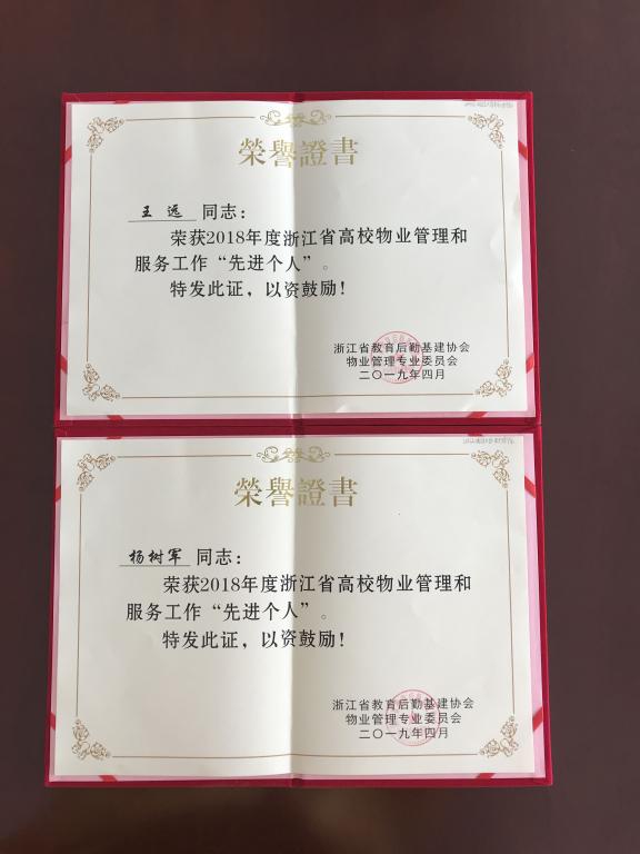 最后,年会表彰了2018年度浙江省高校物业管理与服务先进班组、先进个人和省高校后勤“优秀物业人”,并对第八批浙江省高校教育超市“标准店”进行授牌。我院公共事务部物业服务中心维修班组被评为“先进班组”;经营发展中心杨树军、物业服务中心王远被评为“先进个人”;印象校联东方学院店被评为浙江省高校教育超市“标准店”。