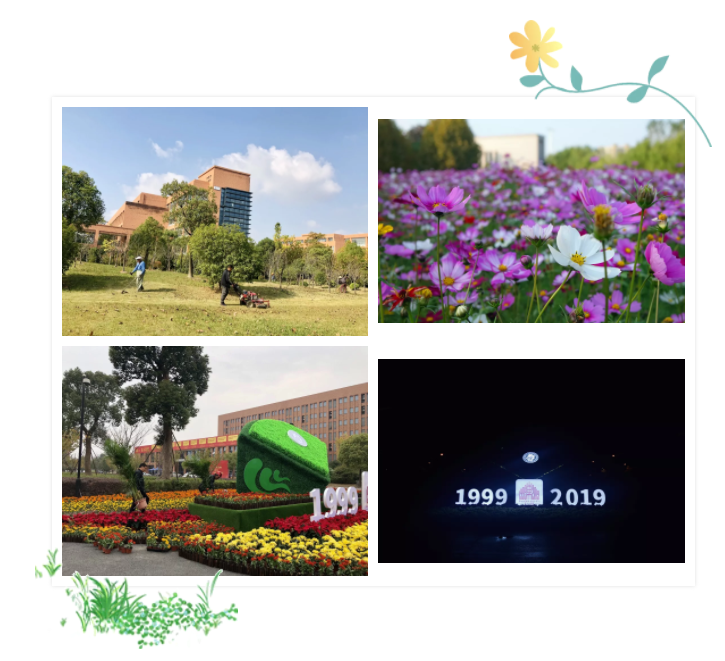 鲜花绿植,靓丽东方。为保障院庆期间良好的校园绿化景观,物业服务中心绿化班组加强绿化养护力度,精心养护学院各个区域的绿植,并对影剧院、校园主干道、图书馆、东南角季象性花卉、金牛广场等主要区域进行了花卉布置;为凸显绿化景观效果,物业服务中心还在绿雕处加装了灯带。