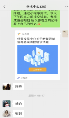 新型冠状病毒肺炎疫情牵动着全国人民的心,也时刻牵动着经营发展中心全体员工的心。为全力做好疫情防控工作,切实提高中心全员的防范意识,提升疫情防控的自觉性、主动性,进一步降低病毒传播风险,经营发展中心组织全体员工开展“新型冠状病毒肺炎防控知识测试”活动。