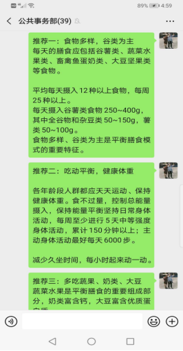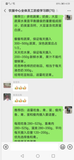 为把疫情防控工作抓实抓细,加强对健康理念的宣传教育,近日,饮食服务中心在微信群发布“健康饮食”、“新冠疫情防控健康饮食小贴士”、“疫情防控常识”等相关文章,引导员工健康膳食、增强自身免疫力。