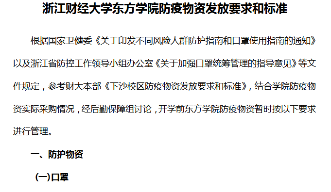 科学统筹,制定标准。在省厅相关文件指导下,资产管理中心结合工作经验及疫时实际情况,及时摸清了开学前后校园防疫物资需求底数。同时,密切与财大本部以及同济浙江学院、杭师大钱江学院等省内独立学院联系沟通,及时了解他校的配备与使用情况,先后制定了《东方学院防疫物资发放要求和标准》、《危险物品存放与使用管理规定》、《防控物资捐赠和管理办法》、《防疫物资采购登记一览表》等文件,确保防疫物资管理规范有序。