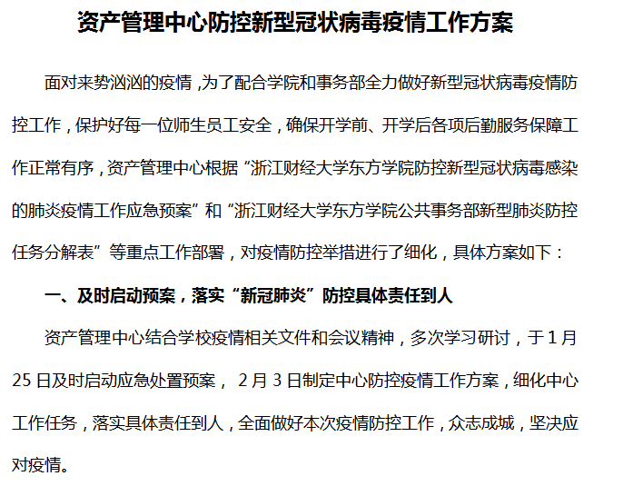 加强领导,落实责任。在学院制定防疫工作应急预案后,资产管理中心根据部门工作部署,及时制定了《资产管理中心假期防疫工作方案》、《资产管理中心开学后防疫工作方案》和《任务分解表》,细化中心工作任务,落实具体责任到人,切实做好本次疫情防控工作。