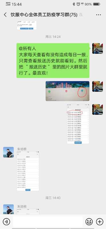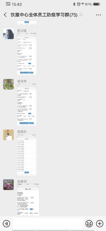 疫情来势汹汹,全国人民都停下脚步,在家隔离共度难关。为了在疫情期间实时掌握员工动态,宣传防疫知识,发布学院通知,饮食服务中心在微信上建立了一个全体员工的临时“家庭群”。学院要求所有教职工每日在线上完成“每日一报”的填报上传工作,由于中心有近半数员工年龄在50岁以上,对手机上的系统操作不熟悉,中心科室就在“家庭群”中以图文并举的方式逐步教大家操作过程,对部分不识字的员工就和他们的子女取得联系,传达相关通知,通过员工口述、子女操作的方式完成相关填报工作。从“每日一报”到“钉钉”的个人信息申报,再到健康码的获取,每项进度都以微信、电话、视频等多种渠道完成,务必确保人人知晓、落实操作到位。从2月4日“每日一报”上线以来,饮服中心73名非编员工做到每日及时上报,无一人漏报。