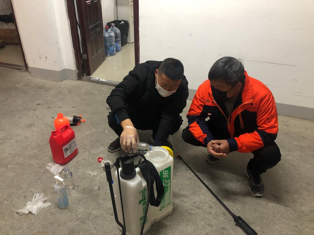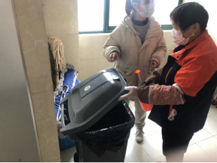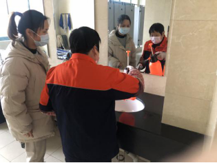 保洁员在管理员指导下进行消毒演示