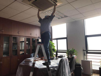 在空调清洗消杀之前,物业服务中心提前谋划、周密安排,为不影响正常教学和工作,教学区空调清洗消杀工作统一在校洗车点进行。工作人员认真对空调内机进行全方位擦试清洗、消毒,对办公区域进行清洗时,为防止灰尘下落,在办公桌上铺好防尘膜。
