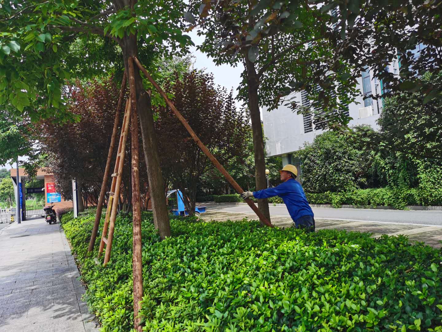 台风过后,物业服务中心仍不懈怠,组织人员对学院内苗木、公共设施等进行了排查。本次台风对校园影响较小,路面落叶清扫等工作也正在有序开展。