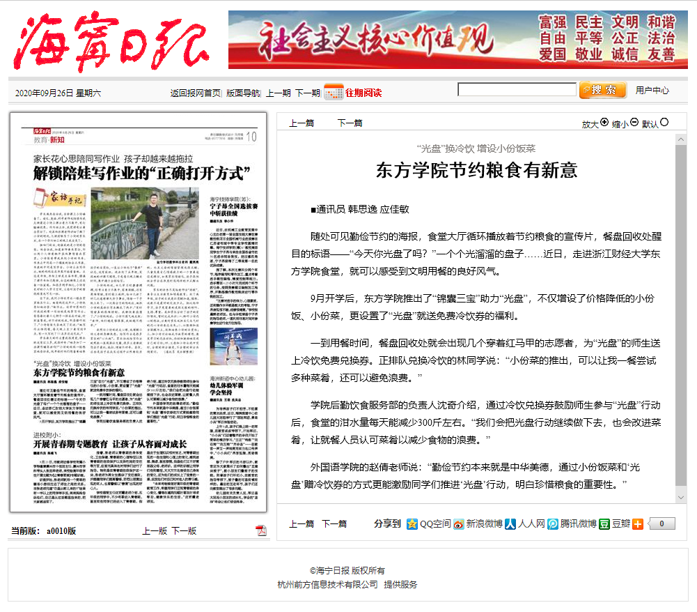 9月开学后,东方学院推出了“锦囊三宝”助力“光盘”,不仅增设了价格降低的小份饭、小份菜,更设置了“光盘”就送免费冷饮券的福利。