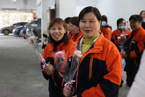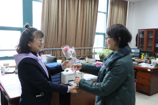 3月8日上午,后勤基建部部长王晓玲、副部长金佩霞为到岗的每一位女职工逐一送上代表“热爱与美丽”的康乃馨,感谢女职工长期的付出和努力,并送上节日的美好祝愿。物业服务中心员工邵进娣开心地表示:非常感谢分工会在节日里送上的浪漫小惊喜。