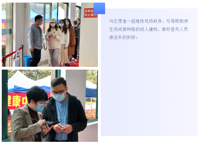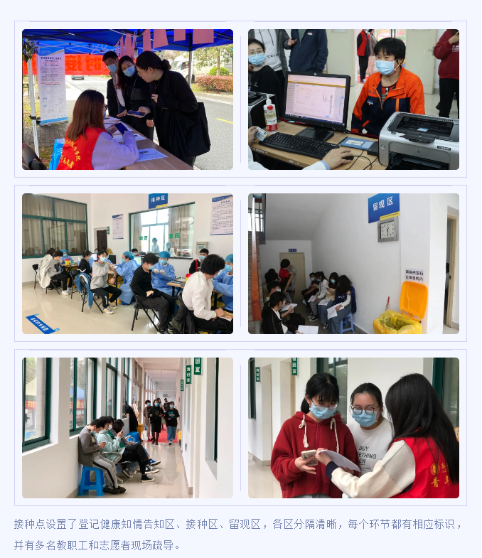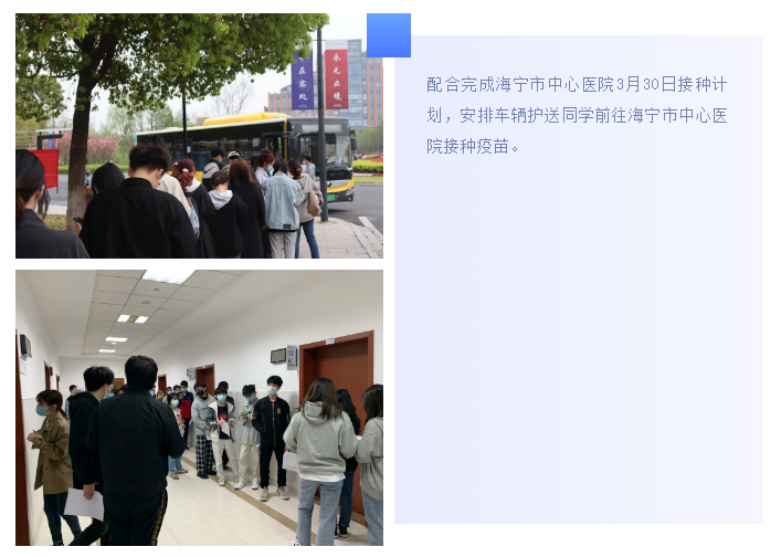 在属地政府、卫健局和海宁市中心医院的大力支持下,我院以最快的速度设置了校内方舱疫苗临时接种点。3月31日(11:30-21:00)和4月1日(8:00-19:00)期间,校内方舱式临时接种点共计接种新冠病毒疫苗2324剂次。接下来,我院将继续配合属地有序推进疫苗接种工作,构筑起校园健康防护线。