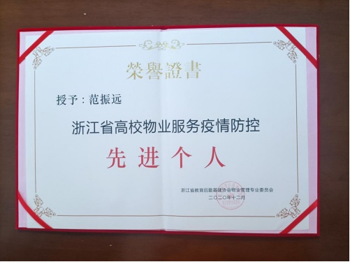 大会上,表彰了省高校后勤物业、公寓、商贸系统疫情防控先进集体和个人,我院后勤基建部物业服务中心荣获“浙江省高校后勤物业、公寓、商贸系统疫情防控先进集体”称号,后勤基建部范振远荣获“浙江省高校后勤物业、公寓、商贸系统疫情防控先进个人”称号。