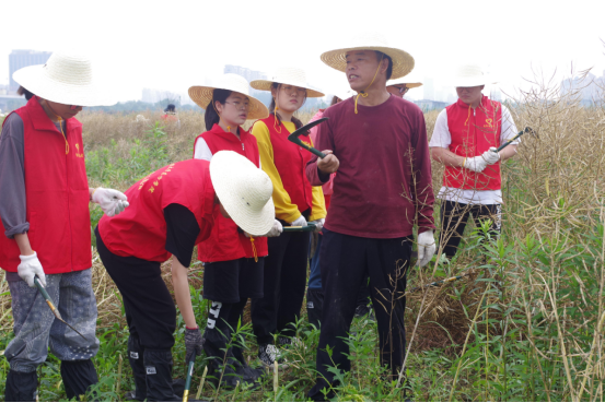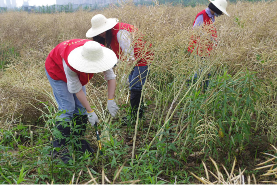 油菜地里,“红马甲和小草帽”活力满满,有的忙于收割,有的将收割下来的油菜杆摆放整齐,彼此配合,相互帮助,体验农忙时节的收获。