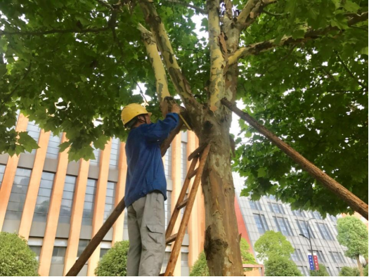 绿化班组联合绿化养护单位对主干道的乔木高枝、枯枝、朽木进行修剪,做好全校树木防台支撑木的检查和加固工作,并安排人员及时关注人工湖的水位,做好湖水排放的准备,消除安全隐患。