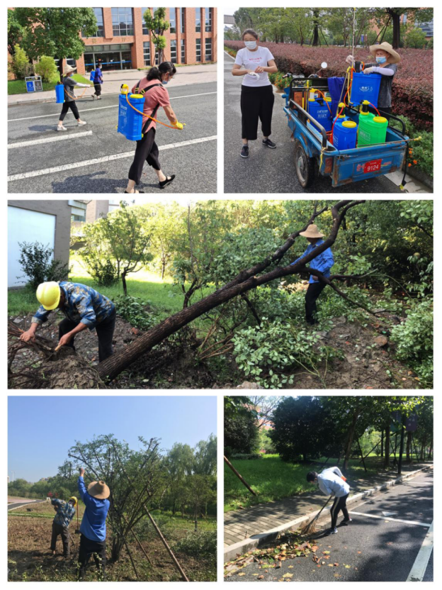 “烟花”过境,物业人已奔赴下一个战场,保洁员们开始对学院进行清理消杀工作,防控病媒生物,筑牢学院安全屏障。绿化班组抢救吹倒的树木,修剪枝杈,重新固定防台支撑木;劳动基地萌芽半月的向日葵幼苗经过台风的肆虐惨不忍睹,绿化负责人立马安排人员除虫杀菌,重新补种,确保向日葵花田的良好生长状态。