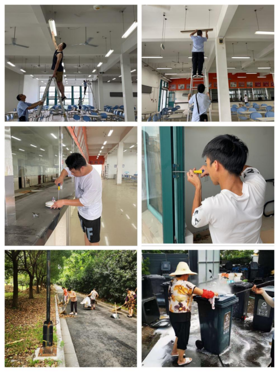 零星小修和校园卫生也紧随其后,完成宿舍楼门窗检修、一食堂三楼座椅、电扇、电灯维修等零星维修。学院垃圾点垃圾清洗消杀,不定期开展环境卫生突击工作,根据学院安排着重加强暑期行政楼、体育馆等地的卫生情况,守护校园的良好环境与公共卫生。