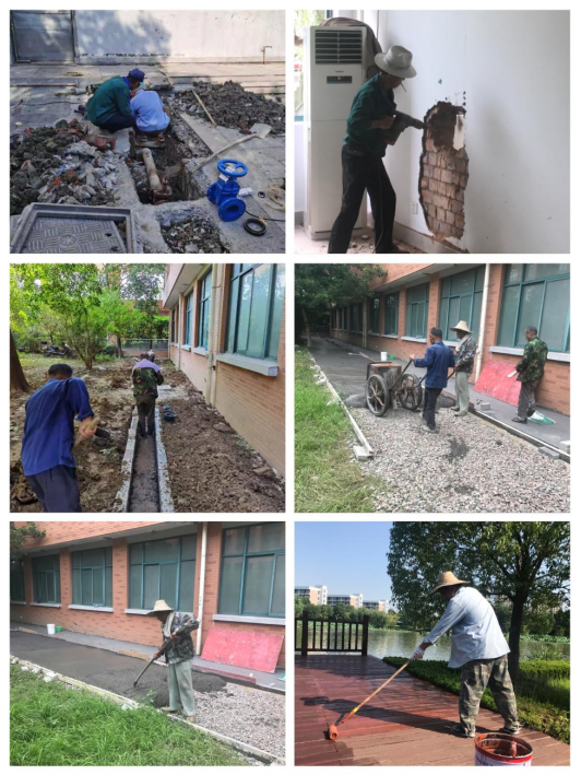 暑假一开始,校园维修便开始忙碌起来,工程班组的工人们加紧施工,马不停蹄地奔走于各个维修改造现场,深入学校每个角落开展工作:补葺学院清水平台、情人坡等地的防腐木;修缮漏水点、开挖空调外机排水沟;粉刷墙壁;教学区楼梯扶手油漆;改造医务室房间;清运化粪池等各项工程有序开展。