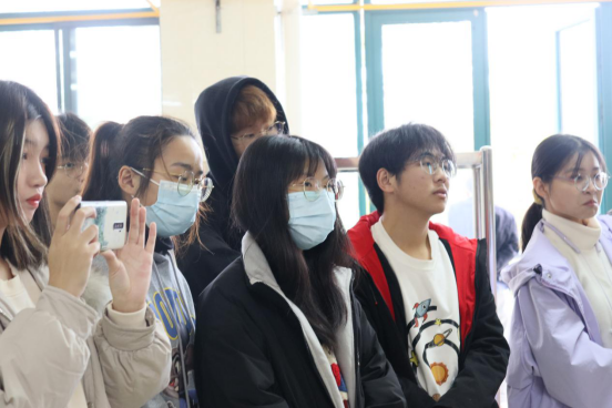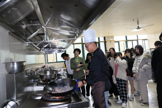 在上灶烹调中,糖醋鱼需要确保鱼肉鲜嫩且完整,就不能随意用铲子翻炒,而让鱼肉服帖地在锅内转动;要让爆鱼香酥入味,就必须先用七成油温使其定型,然后再用中火蒸发鱼肉多余的水分,便于沐浴在汤汁中更好的入味。邓老师操作的细致,师生们听得专注。