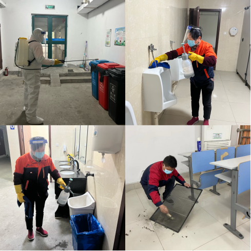 各班组通力合作,守住校园环境,“疫”尘不染守住师生卫生健康,助力开学复课准备。