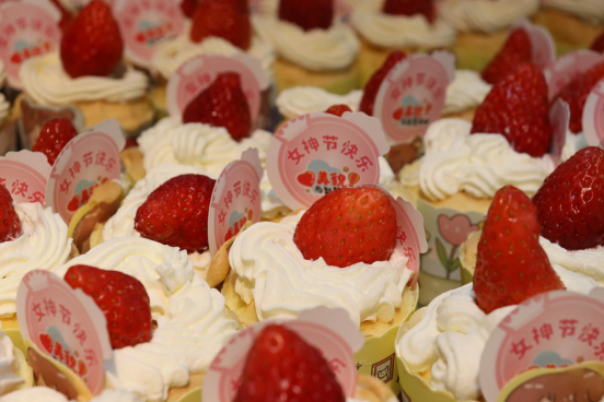 三八节当天,饮服中心组织骨干力量精心准备了两千余份草莓奶油蛋糕赠送给女神们。