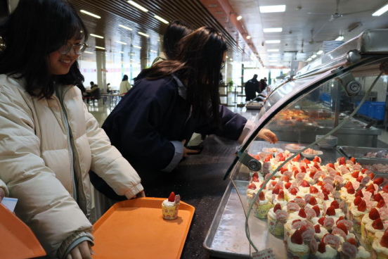 中午时段,蛋糕赠送窗口被女神们包围,纷纷领取她们的节日礼物。有的是一个宿舍集体出动,每人一个相互比较;有的拿出手机拍照上传朋友圈,记录下这份节日的甜蜜。几乎每个女生的餐桌旁都有一个蛋糕,整个餐厅也瞬间洋溢着节日的氛围和甜蜜的芬芳。(文:沈奇/图:杨洁)