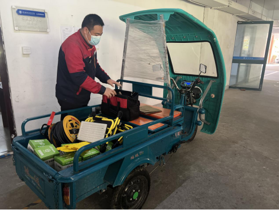 模拟演习中,中心负责人范振远接到校园突发疫情指令后逐级传达并强调相关工作。保洁主管叶伟民在接到工作指令后,第一时间联系消杀人员和物资搬运小组负责人,布置疫情防控任务。消杀人员穿戴好口罩、防护衣、护目面罩等个人防护用品,配好消毒液,奔赴指定场地认真做好通风、消杀任务;物资搬运小组迅速开展核酸检测场地的物资搬运及帐篷搭建等工作;维修主管王陈斌接到指令后,搬运物资前往核酸检测场地,做好线路连接、灯光设备的布置工作。