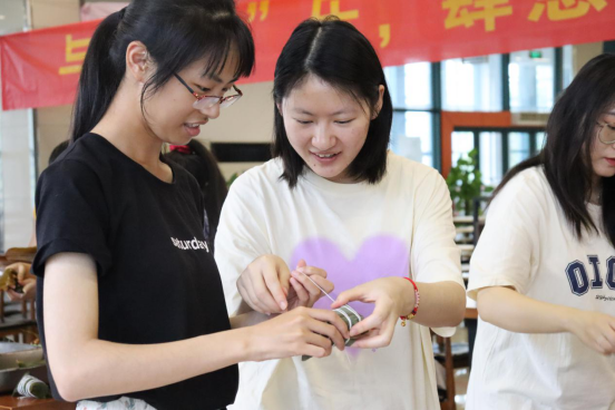 “光粽耀祖队”、“粽志成城队”、“四芳斋队”,活动当天同学们5人一组,每组都给自己取了一个与粽子有关的队名;队伍中有带着室友一起参加的姐妹淘,也有大四的学长怀着对学校的思念,在毕业之前想多留下一点校园生活的美好回忆。在包制粽子时,大家都聚精会神,折角、罐米、放馅、封口、捆绳,每一个动作都做得有模有样。一个小时的制作,每个小组都完成了四五十个粽子。经过专家和组员的共同评定,“四芳斋队”获得24朵小红花,成为第一名。活动最后,同学们还与阿姨们一起用糯米、红豆、小米、绿豆黑米5种不同的原料包制了一个大团圆的“长粽”。