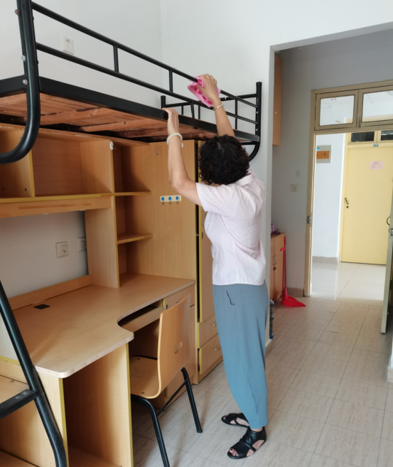 开学之际,公寓员工打扫新生房间、清理堆积杂物,全面清理了公寓卫生死角,并定期消杀防控病毒传播。