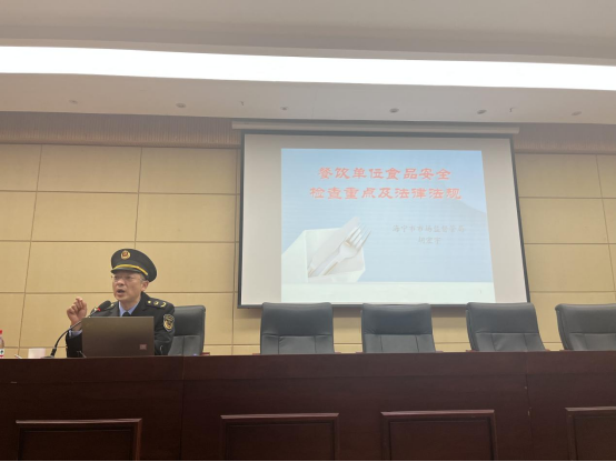 10月27日,饮食服务中心组织校内餐饮从业人员及外包单位员工在学术中心2号报告厅开展食品安全培训,特邀海宁市市场监督管理局长安分局胡宏宇副局长主讲。