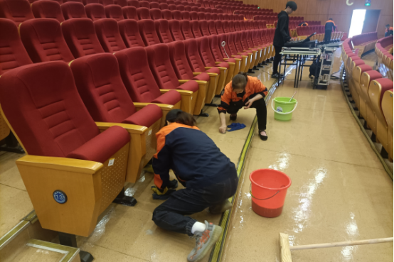 保洁班组全力做好场地卫生保洁工作,座位清理、台阶清洗、休息区保洁、绿植摆放、物资搬运等场地保障一丝不苟。从前期卫生保洁、会场布置到典礼彩排、结束,全程安排保洁人员守护,为典礼的顺利召开保驾护航。