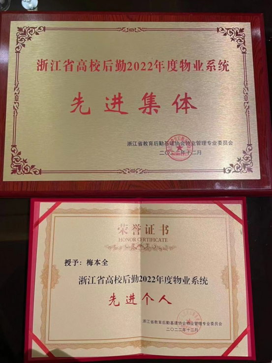 议程最后表彰了浙江省高校后勤2022年度物业系统浙先进集体、先进个人。后勤基建部物业服务中心荣获浙江省高校后勤2022年度物业系统先进集体,物业服务中心梅本全荣获浙江省高校后勤2022年度物业系统先进个人。(文:张瑟)