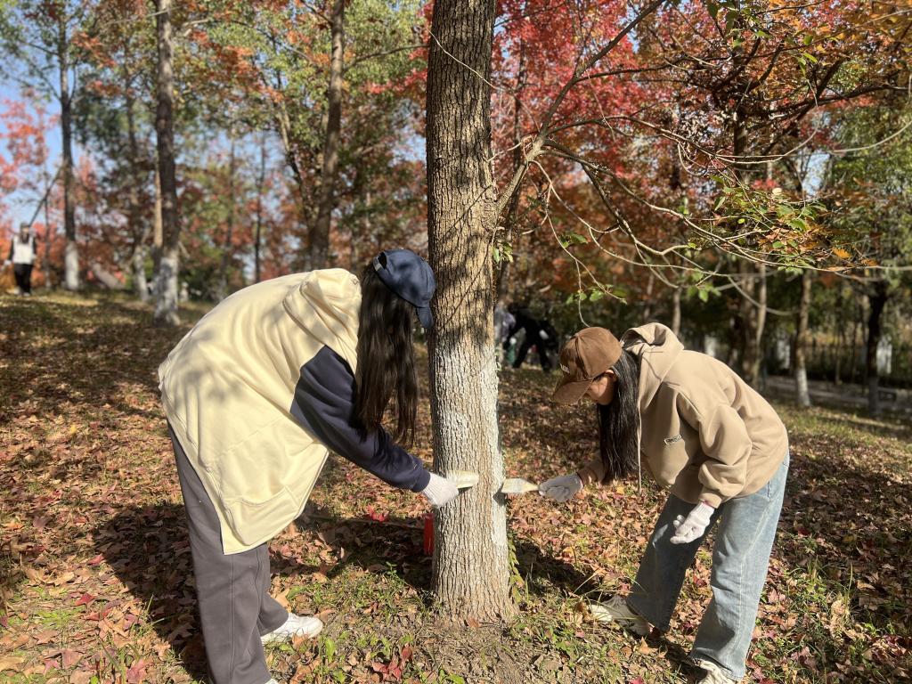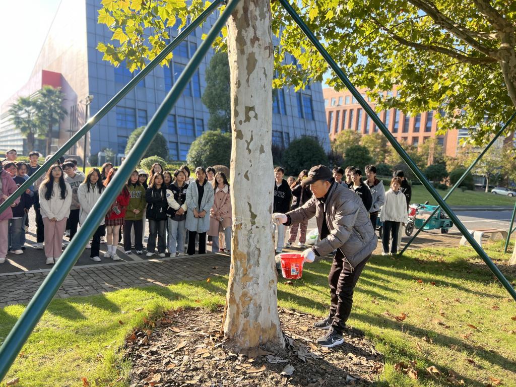 “给树木涂白最主要的作用就是抗寒杀虫,气温降低后,很多虫子变成虫卵或者钻进了泥土,等来年开春后再次爬上树干,涂白的材料可以起到除菌保暖的作用,还可以趋赶来年的虫子......”梧桐树下、情人坡边、生活区内......物业服务中心的绿化主管梅本全在耐心的传授树木涂白的作用和技巧。同学们化身一个个粉刷小匠,干劲满满。历时大半个月,8场涂白劳动课堂,累计师生近700人共同完成学院树木的涂白工作。