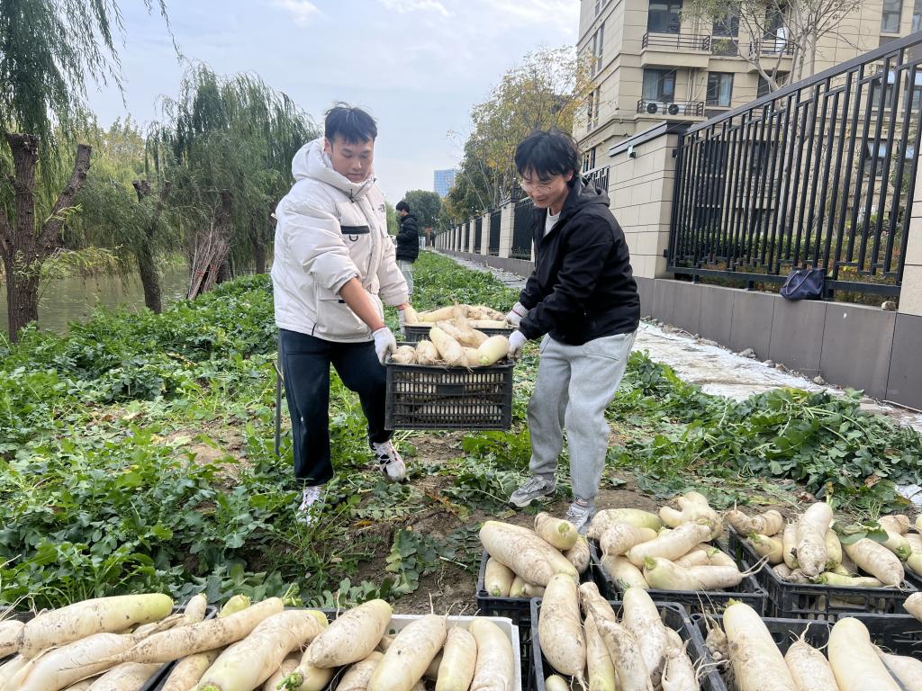 “哇塞,这个萝卜跟我的小腿一样粗诶!”“你们看我拔出来的萝卜像不像胡巴。”“这边这个更大,我拔不出来,快来我帮一把。”东方小菜园里传来阵阵欢呼声。短短一个小时,拔萝卜、择叶子、装筐、搬运,25名外国语学院的师生、物业服务中心的工作人员携手一起收获近1500斤的白萝卜,看得见的成果让大家惊喜满满。随后,这些劳动成果运至一食堂加工成美味的冬季暖身佳品,免费供师生品尝。