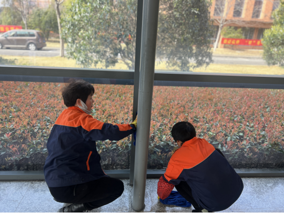 “擦玻璃的第一步:放置‘正在清洁中’提示牌,检查所用工具有无破损,能否正常使用,玻璃是否有破损、划痕现象,发现问题及时汇报;第二步:“玻璃下方地面放置毛巾做地面保护,用铲刀去除黏附在玻璃表面的污渍……”保洁管理员向保洁员们讲解擦玻璃的步骤和注意事项;“用海绵擦蘸上清洁剂打湿玻璃,然后用玻璃擦自上而下有规律地擦拭,整个过程镜面从模糊到剔透,最后擦拭玻璃窗台、边框”保洁员范桂华示范演示。示范结束后,保洁员们拿着工具在各自的区域里实际操作,最后由管理员们检验成果。