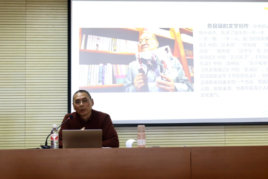 王学海以《比较视野下,金庸的乡土书写与隐喻写作》为题,从金庸其人及武侠小说、文学研究等角度,畅谈了金庸小说与海宁的渊源及隐喻写作手法,他表示,金庸先生的作品作为华人文学的一个奇迹,其小说隐喻的深意和文脉传承值得我们细细品读。讲座中,王学海旁征博引,就金庸的武侠小说人物、家国情怀以及当代价值等问题做精彩解读,将金庸的侠义精神、文化自信娓娓道来。讲座结束后,王学海与师生们互相交流、探讨,现场气氛热烈。