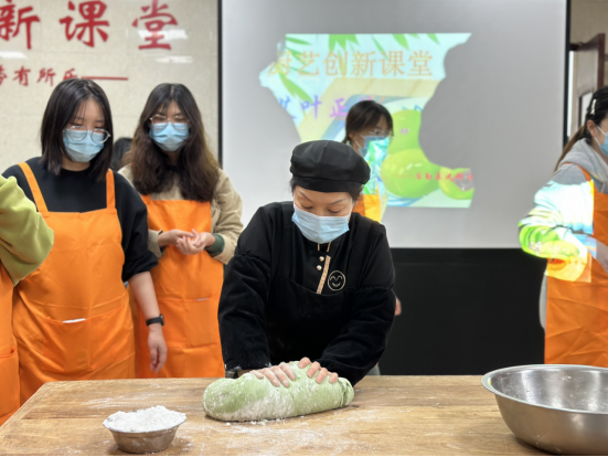 煮艾叶、调青汁、调馅、和面、揉面、包青团……3月26日,新一期厨艺创新课堂在一食堂二楼展开,面点师魏芬玲正带领同学们制作青团。魏芬玲是学院一食堂的面点师,包子、饺子、大饼、油条、麻花、粽子、桃酥……这些中式糕点她都擅长。其实,魏芬玲这手艺完全是自学的,线下课程、线上视频、同行交流……都是她学习的渠道。